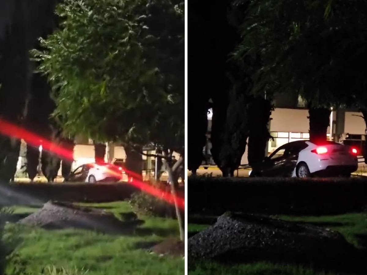 Videos difundidos en redes sociales muestran el momento en que el automóvil desciende por una rampa y avanza entre árboles hasta llegar al patio principal.