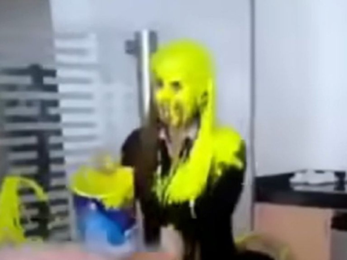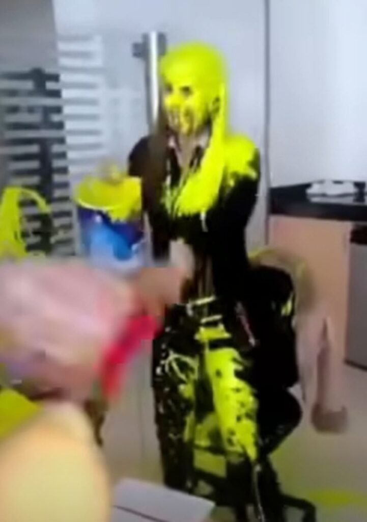 En la grabación se observa como una mujer se encuentra detrás de un escritorio bañada completamente en pintura amarilla mientras le están arrojando los mismos objetos de la oficina a la cara y el cuerpo, poco a poco se levanta de su asiento impactada por lo sucedido.