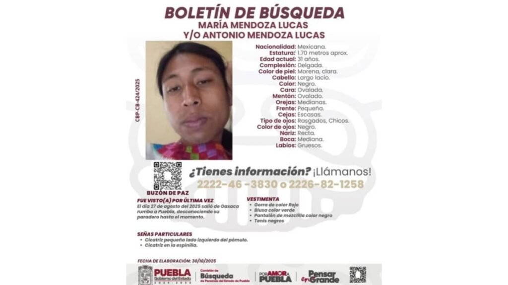 Familiares, amigos y activistas buscan a María Mendoza Lucas, mujer trans y defensora del territorio, desaparecida desde el 27 de octubre. Fue vista por última vez cuando viajaba de Oaxaca hacia Puebla. La Comisión de Búsqueda de Personas del Gobierno de Puebla emitió una ficha con sus datos. María tiene 31 años, mide 1.52 metros … Sigue leyendo Buscan a defensora trans desaparecida; viajaba a Puebla