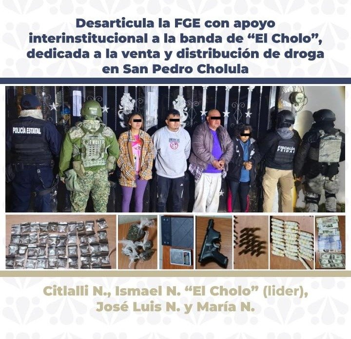 La Fiscalía General del Estado (FGE) de Puebla, con apoyo de la Secretaría de la Defensa Nacional (Sedena), la Guardia Nacional (GN) y la Secretaría de Seguridad Pública Estatal (SSPE), desarticuló la banda conocida como “El Cholo”, dedicada a la venta y distribución de drogas en el municipio de San Pedro Cholula.