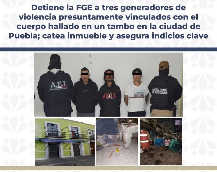#Entérate 🚨🔴 || La Fiscalía de #Puebla detuvo a tres presuntos responsables del homicidio de un hombre hallado en un tambo en inmediaciones del Mercado 5 de Mayo; también aseguraron droga e indicios clave tras cateo en inmueble vinculado.@farodigitalpue pic.twitter.com/593DbyZZ7K
