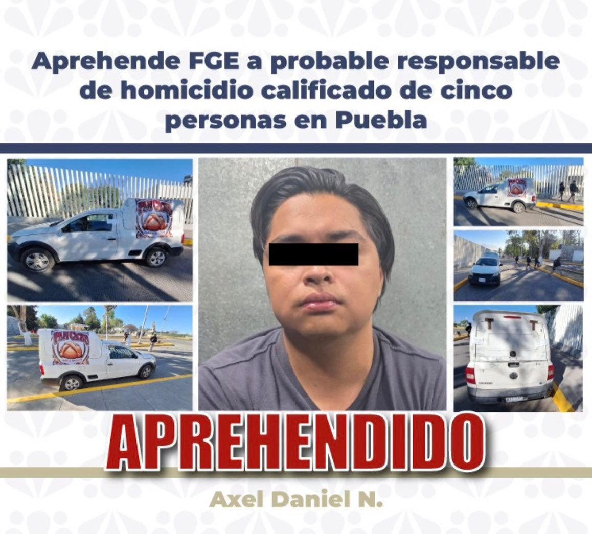 La Fiscalía General del Estado de Puebla aprehendió a Axel Daniel N., probable responsable de homicidio calificado, relacionado con los hechos del 11 de abril de 2025, cuando cinco personas fueron privadas de la vida y posteriormente localizadas al interior de un vehículo en… pic.twitter.com/kamAXvrvOh