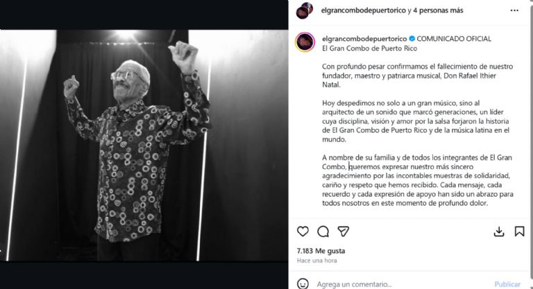 El mundo de la salsa se viste de luto. Rafael Ithier Natal, la legendaria figura, pianista y director de El Gran Combo de Puerto Rico, falleció a la edad de 99 añosEl Gran Combo de Puerto Rico es reconocido por éxitos inmortales como “Me Liberé”, “Azuquita Pal’ Café”. Su partida marca el final de una era y deja un legado musical monumental en la cultura puertorriqueña y global.
