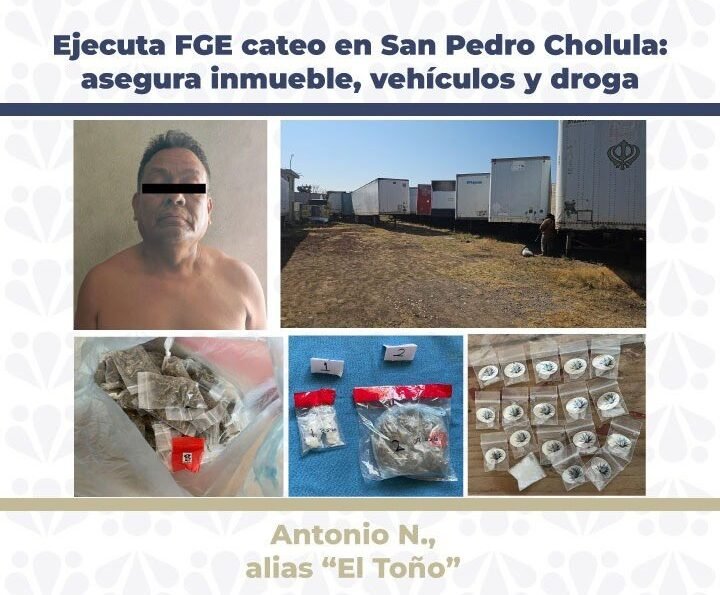 Como resultado de actos de investigación, la Fiscalía General del Estado de Puebla (FGE), ejecutó una orden de cateo en un inmueble ubicado en Santa María Zacatepec, en el municipio de San Pedro Cholula, por delitos contra la salud en su modalidad de narcomenudeo.
