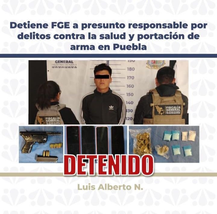 La Fiscalía General del Estado de Puebla (FGE) detuvo a Luis Alberto N., como presunto responsable de delitos contra la salud, portación de arma de fuego sin licencia y