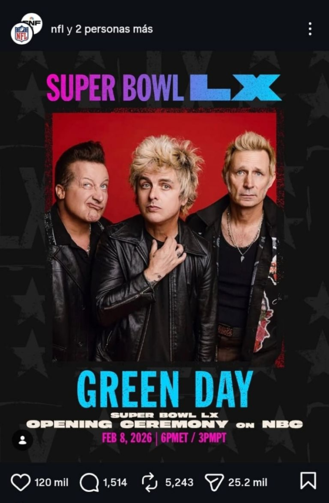 El Super Bowl LX está cerca y cada vez surgen más detalles de uno de los eventos deportivos más importantes del año. Como los relacionados con los espectáculos musicales de los que este domingo se reveló que será Green Day la banda encargada de dar el concierto inaugural. El anuncio se realizó a través de redes sociales, donde se informó sobre la hora en la que comenzará el show de la banda de punk rock.
