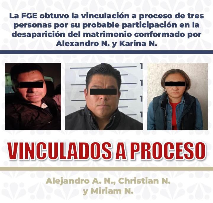 La Fiscalía General del Estado de Puebla (FGE) obtuvo la vinculación a proceso de Christian N., Alejandro A. N. y Miriam N. por su probable participación en el homicidio del matrimonio conformado por Alexandro N. y Karina N.