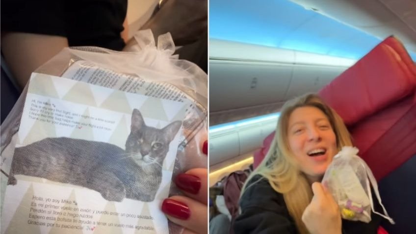 “Resulta que el gatito se llama Mike y es su primer vuelo en avión y su dueña nos regaló esto que tiene un caramelo, un bombón, una toallita húmeda de limpieza, la cartita de él que dice que es su primer vuelo en avión.