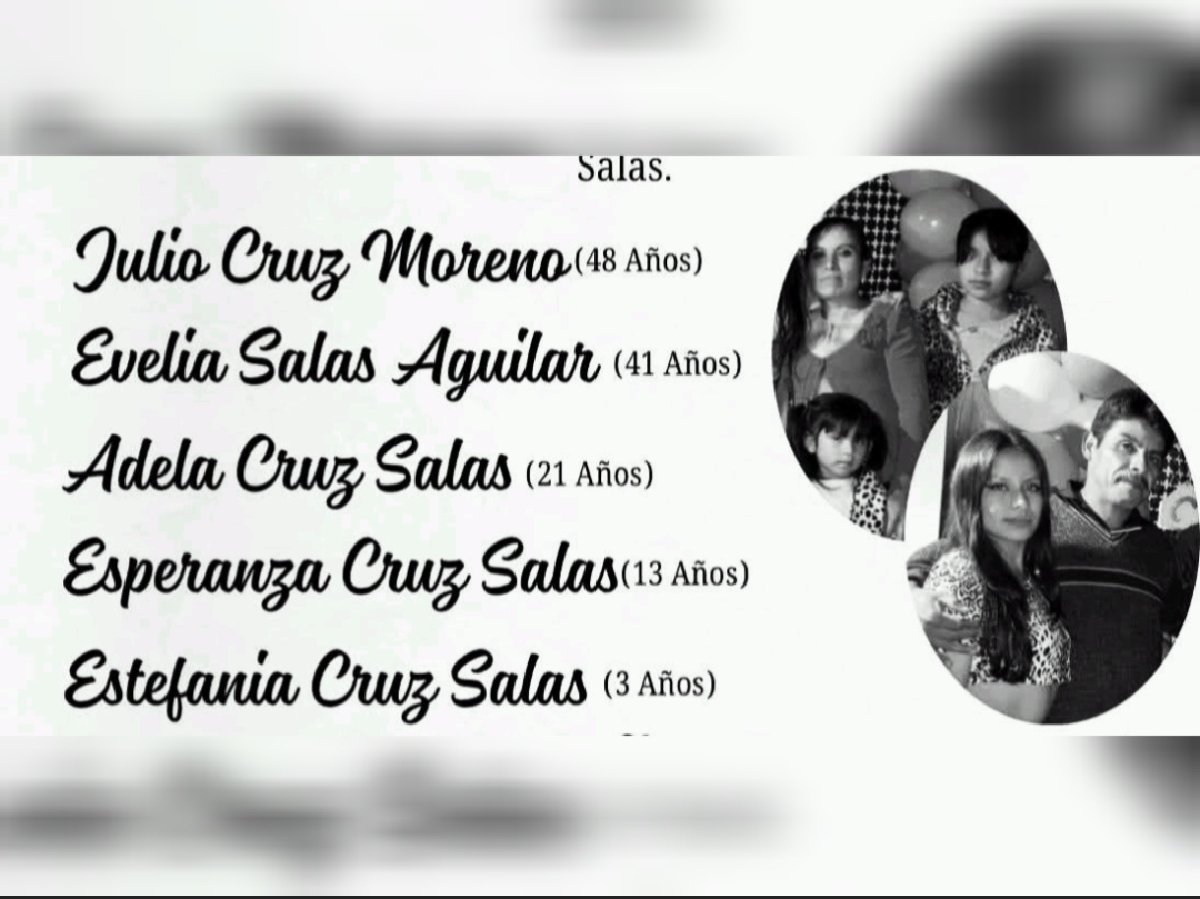 Entre ellas están los cinco integrantes de la familia Cruz Salas. Julio Cruz Moreno de 40 años, Evelia Salas Aguilar de 41, Adela Cruz Salas de 21, Esperanza de 13 y Estefanía de 3.