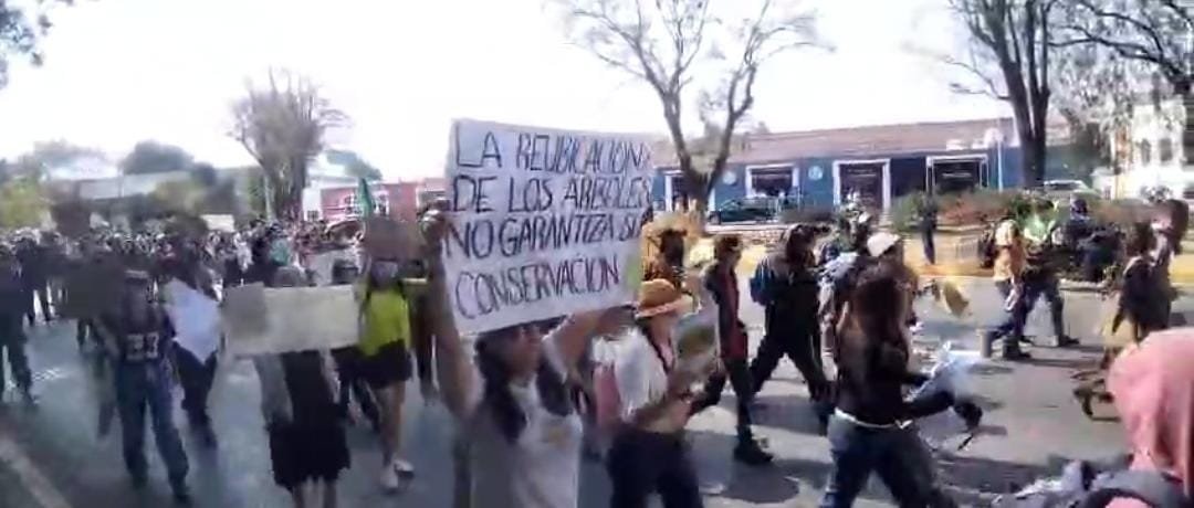 Estudiantes de la Benemérita Universidad Autónoma de Puebla (BUAP) iniciaron una marcha desde Ciudad Universitaria hacia Casa Aguayo para manifestar su rechazo al proyecto del Cablebús.