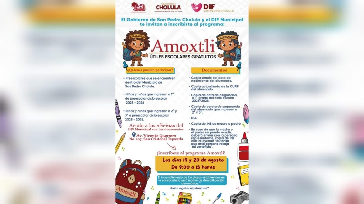 En este sentido, el DIF Municipal, encabezado por la Mtra. Lupita Fernández, mantiene abierto el registro del programa “Amoxtli”, mediante el cual se entregarán de manera gratuita paquetes de útiles escolares básicos para niñas y niños de 3 a 7 años que cursen preescolar en instituciones públicas del municipio, así como en los CAIC.
