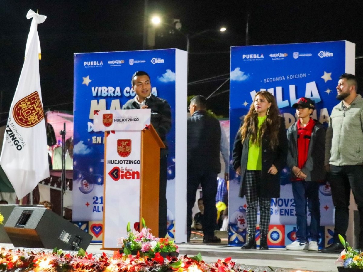 Con el espíritu decembrino llenando la Plaza de Armas “Fray Juan de Alameda”, el Presidente Municipal de Huejotzingo, Roberto Solís Valles, encabezó el ya tradicional encendido de la segunda edición de la Villa Navideña, acompañado por la Presidenta Honoraria del Sistema Municipal DIF, Shamy Spezia, y la Secretaria de Turismo y Cultura del Municipio, Andrea Morales García.