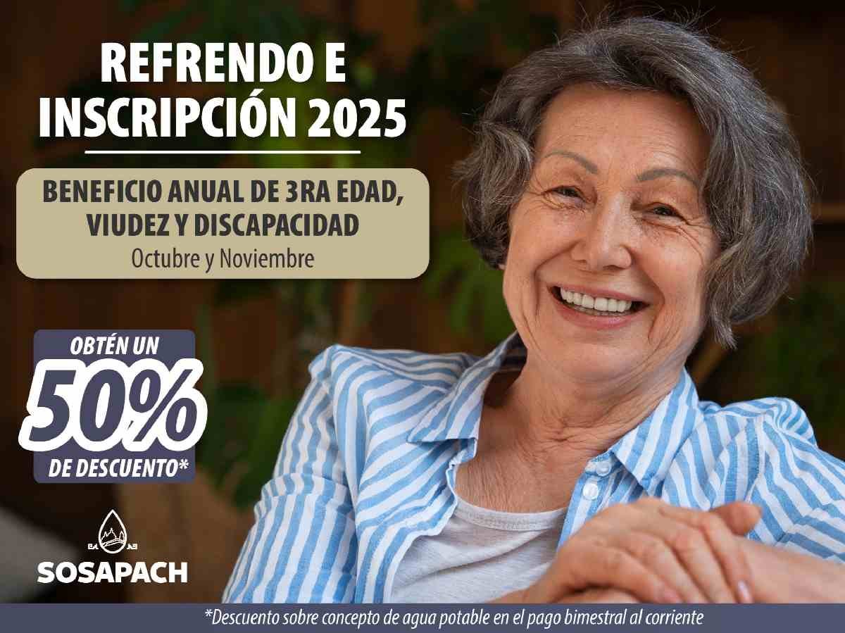 El SOSAPACH invita a todas las personas que ya cuentan con este beneficio a renovar su refrendo a tiempo, y a quienes cumplan con los requisitos a realizar su inscripción, con el fin de acceder al descuento.