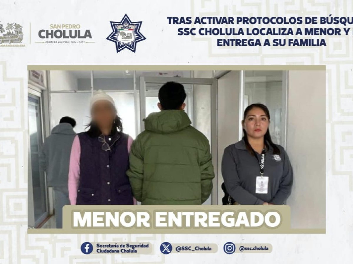 Policías Municipales de la Secretaría de Seguridad Ciudadana (SSC Cholula) localizaron a un menor reportado como desaparecido, luego de activar de manera inmediata los protocolos de búsqueda en San Pedro Cholula.