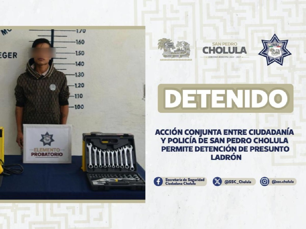 Gracias a la participación de vecinas y vecinos y al reporte oportuno a los números de emergencia, elementos de la Secretaría de Seguridad Ciudadana de San Pedro Cholula (SSC Cholula) detuvieron a un hombre señalado por su probable participación en un robo a comercio en la Junta Auxiliar de Rafael Ávila Camacho (Manantiales).