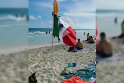 Guardavidas retiran bandera mexicana de un asta de emergencia en Cancún