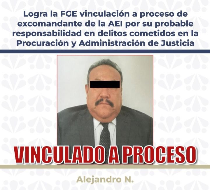 La Fiscalía General del Estado obtuvo la vinculación a proceso de Alejandro N., excomandante de la Agencia Estatal de Investigación (AEI), al considerar el Juez de Control que los datos de prueba presentados por el Ministerio Público, acreditan su probable responsabilidad en delitos cometidos en la Procuración y Administración de Justicia.